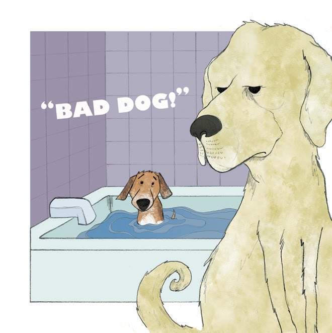 The other full color page I wanted to do was a single page image that really stood out from the rest of my original thumbnails. It's a scene after Ellie makes a mess in the house and Peanut Butter has to throw Ellie in the tub. This takes place right after she is dropped in and PB reprimands her. I think its a really pivotal scene in the book and was a great choice for a finish.